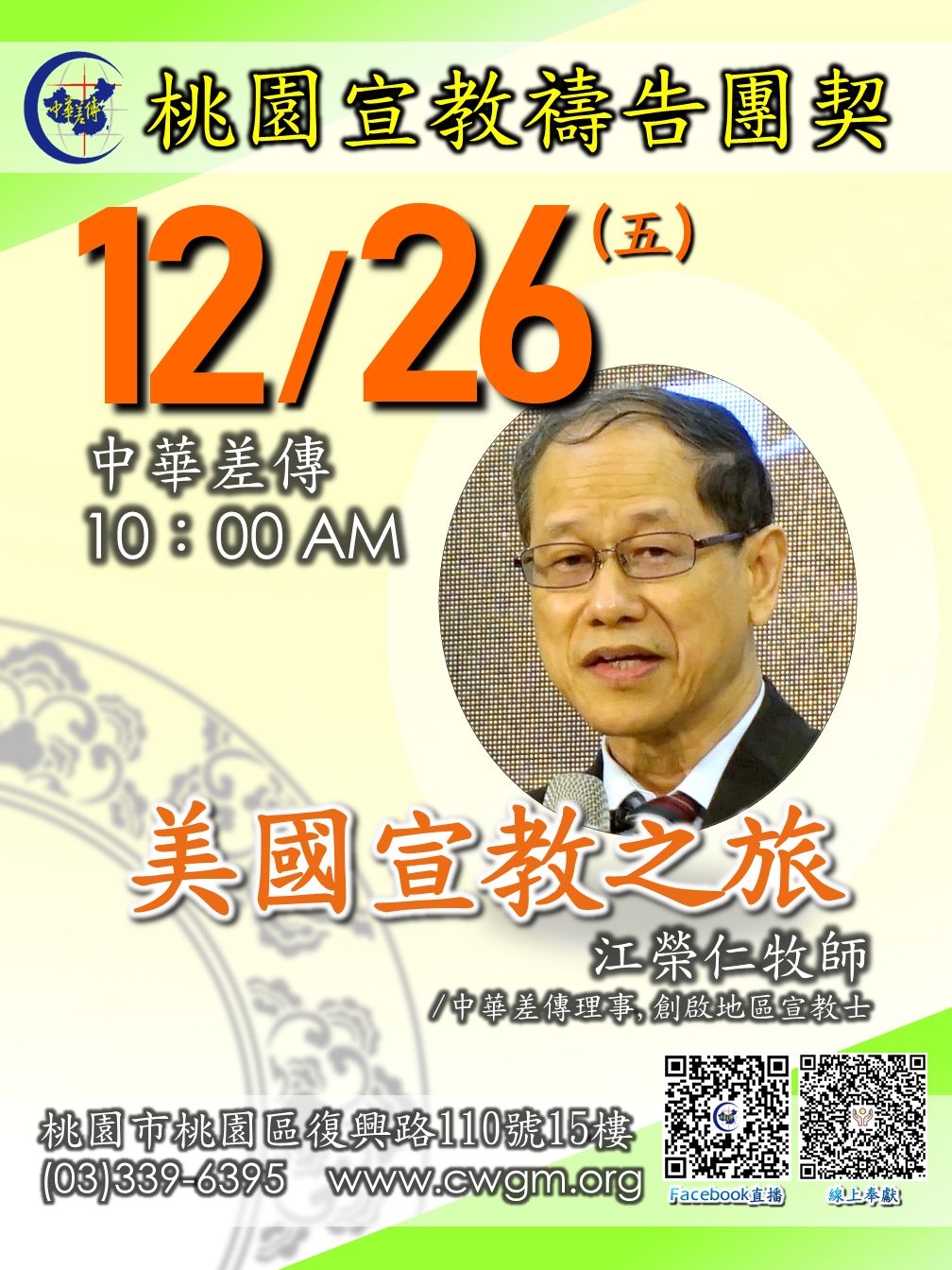 禱告事工禱告團契 12/19 桃園宣教禱告團契 12/26 中華差傳 10:00 AM 美國宣教之旅 江榮仁牧師 /中華差傳理事/創啟地區宣教士 桃園市桃園區復興路110號15樓 (03)339-6395 www.cwgm.org 總瀏覽次數: 2 , 今日瀏覽次數:1