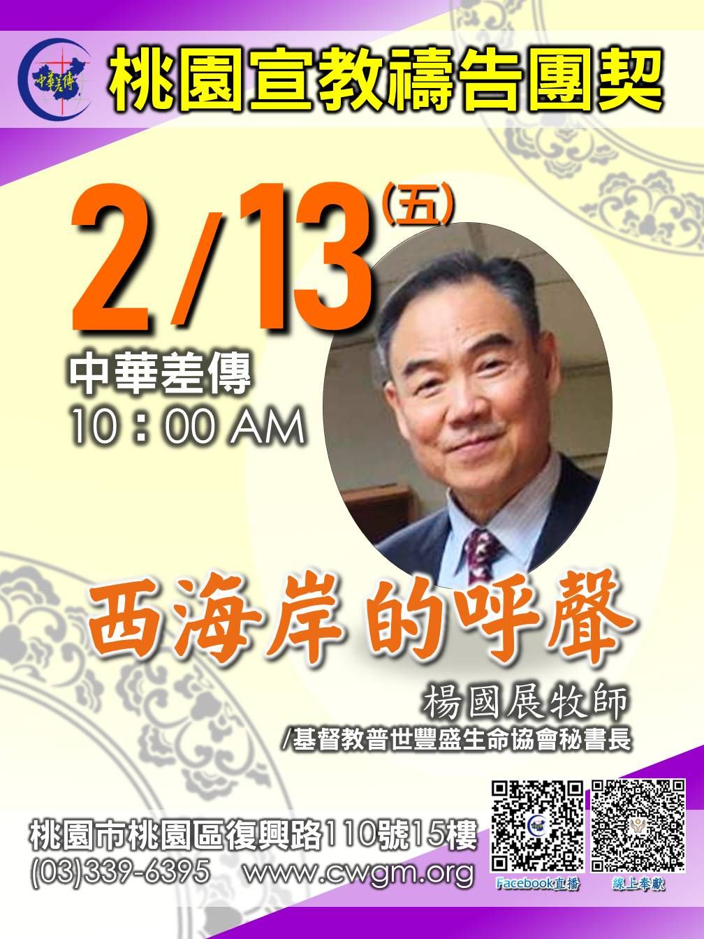 禱告事工禱告團契 2/13 桃園宣教禱告團契 2/13 (五) 中華差傳 10:00 AM 西海岸的呼聲 楊國展牧師/基督教普世豐盛生命協會秘書長 桃園市桃園區復興路110號15樓 (03)339-6395 www.cwgm.org 總瀏覽次數: 3 , 今日瀏覽次數:1