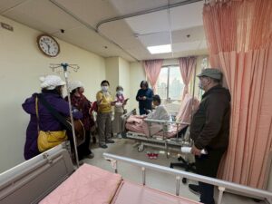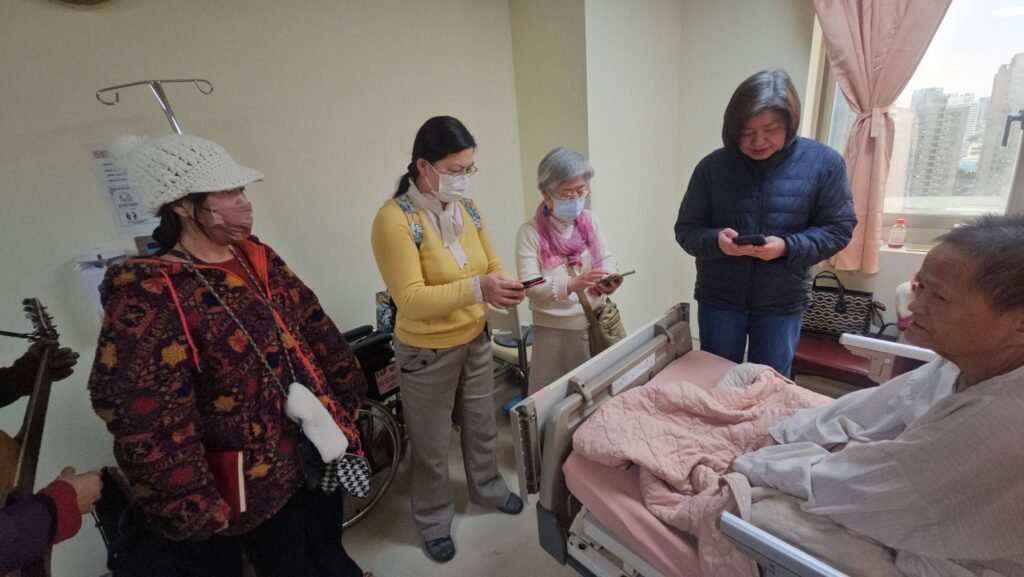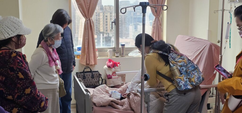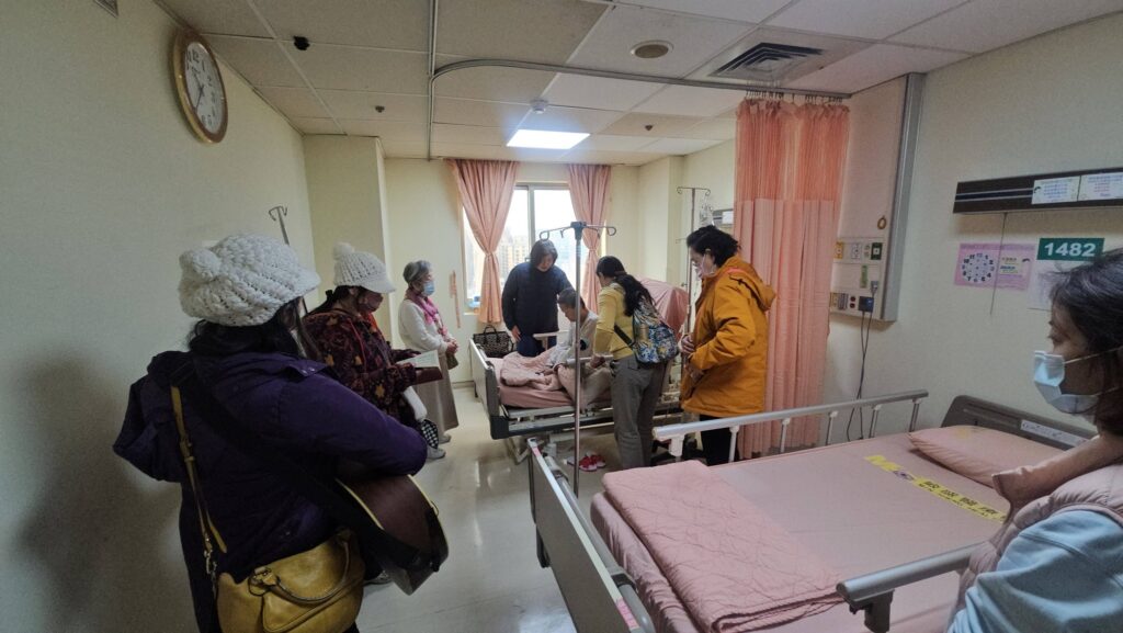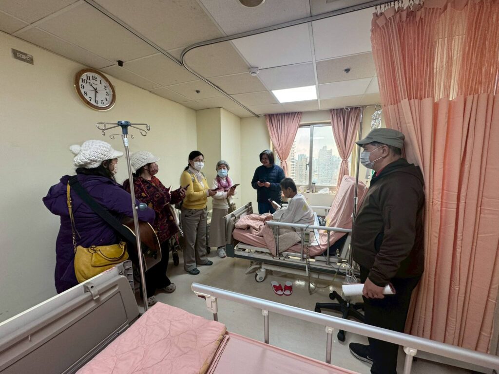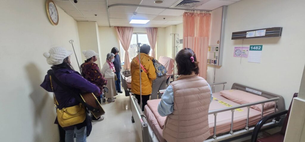 今天10點半禱告會後,我們的志工團隊繼續爲敏盛醫院14樓住院謝姊妹禱告,她是因為侄女告知醫院有教會(關懷中心),就邀請我們爲謝姊妹禱告,她很久沒有去教會……今天我們再去探訪她時,知道她最近會出院,她也樂意我們去她家探訪和轉介給附近的教會跟進,感謝聖靈的工作!
